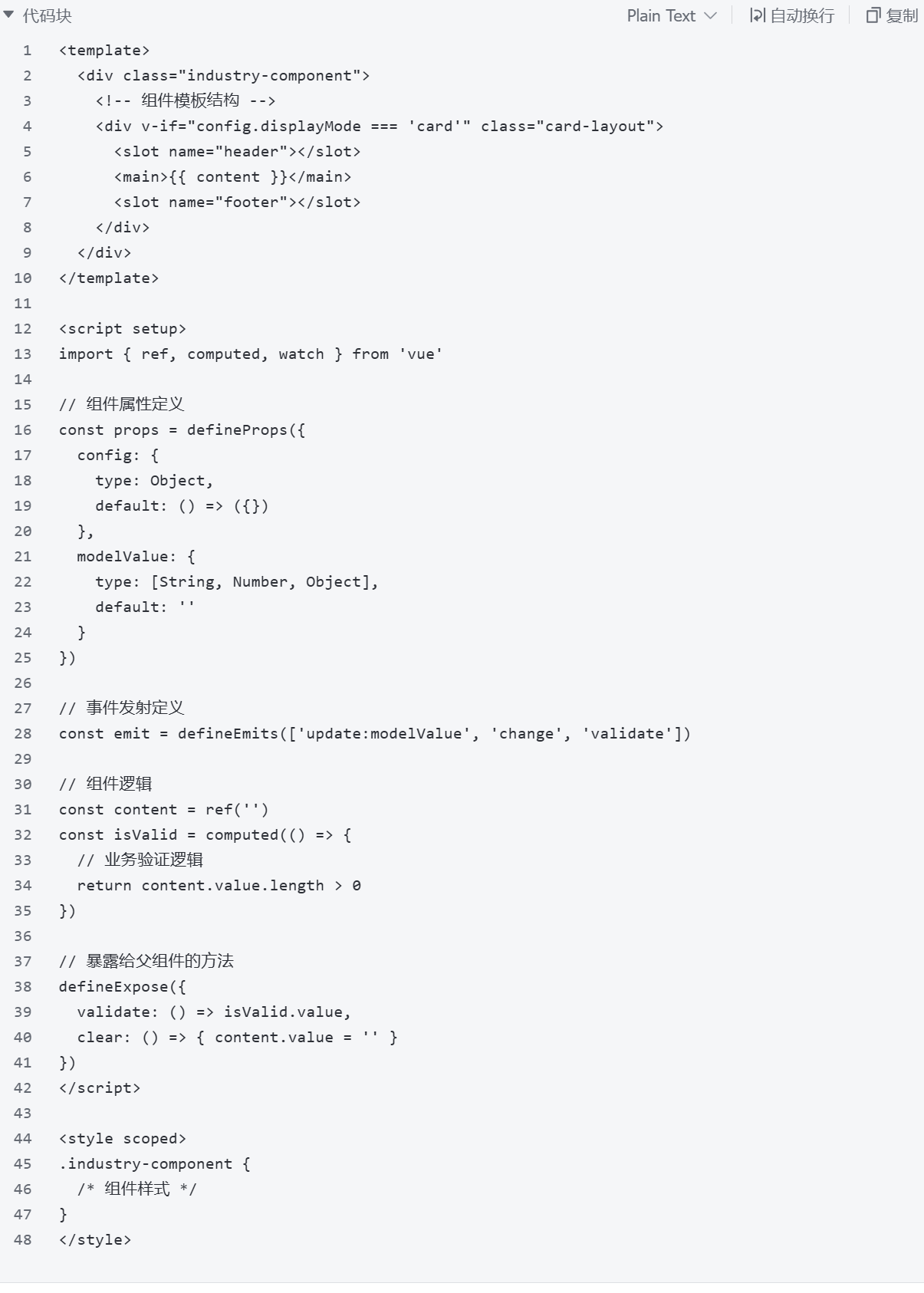 在低代码开发领域,行业专属组件是平台差异化竞争的核心。星云低代码基于Vue3组合式API构建了完整的组件开发生态,让企业能够快速封装行业知识,形成可复用的数字资产。本文将深入解析基于Vue3的组件注册机制、自定义配置项设计与输入输出绑定,帮助您构建真正符合行业需求的专属组件库。
