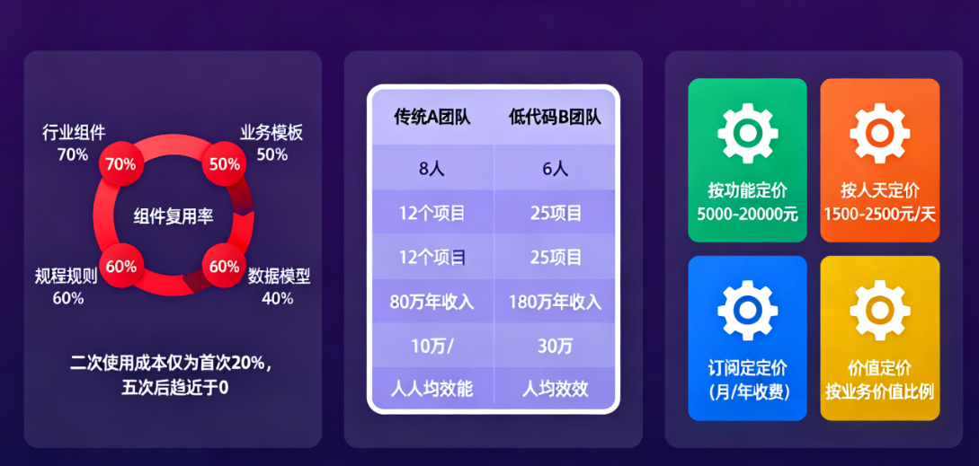 实施团队A(传统模式): ├── 团队规模:8人 ├── 年交付项目:12个 ├── 年定制收入:80万 └── 人均效能:10万/年 实施团队B(低代码赋能): ├── 团队规模:6人 ├── 年交付项目:25个 ├── 年定制收入:180万 └── 人均效能:30万/年