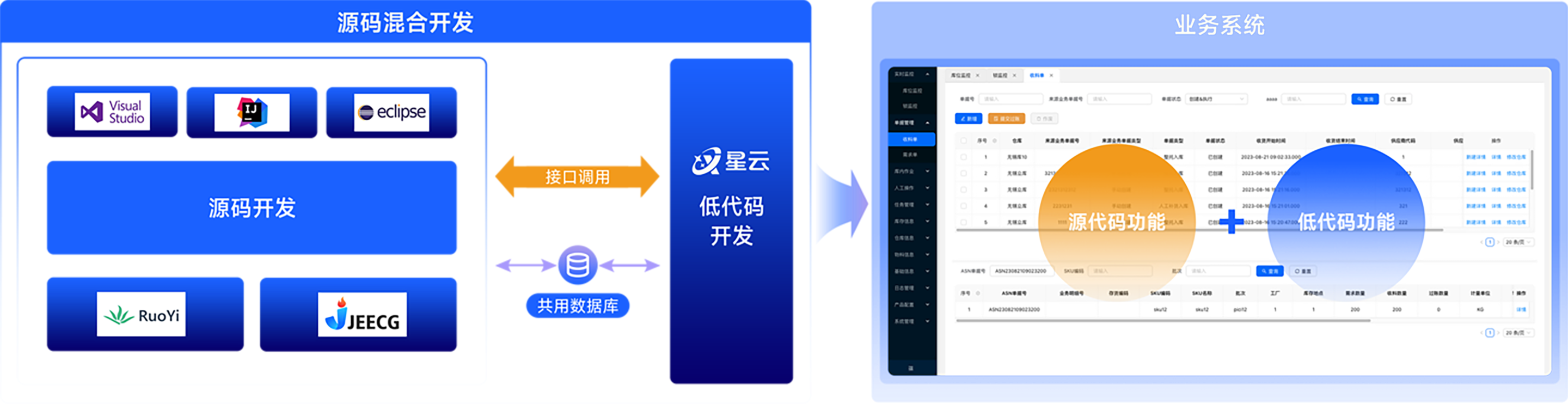 搭配源码混合开发,接口相互调用,共用数据库,实现业务相通,数据相通